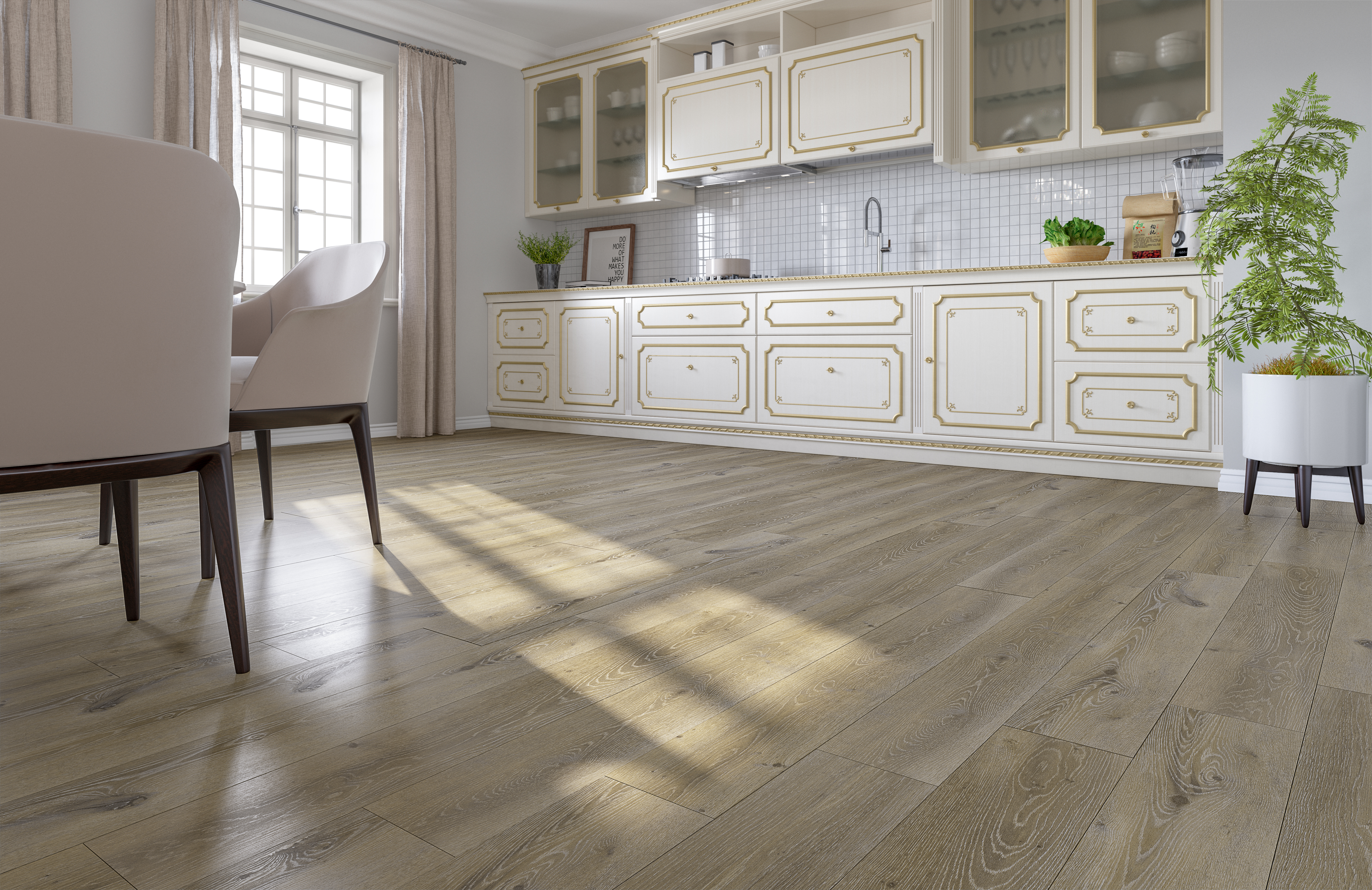 Кварцевый SPC-ламинат — хорошая идея для монтажа на вашей кухне. По нему тепло и приятно ходить, при желании можно подключить любую из систем теплого пола. Такой пол не боится воды от слова «совсем», а значит можно не просто не заморачиваться на этой теме при готовке: можете хоть вылить стакан воды на пол — ему ничего не будет.
