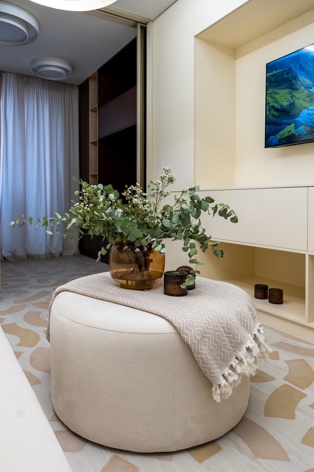Пол — особая «фишка» этого проекта. На кварцевом ламинате Fargo Comfort Ясень Белый JC18001-35 с помощью трафаретов оформили узоры, сделав пол акцентом.