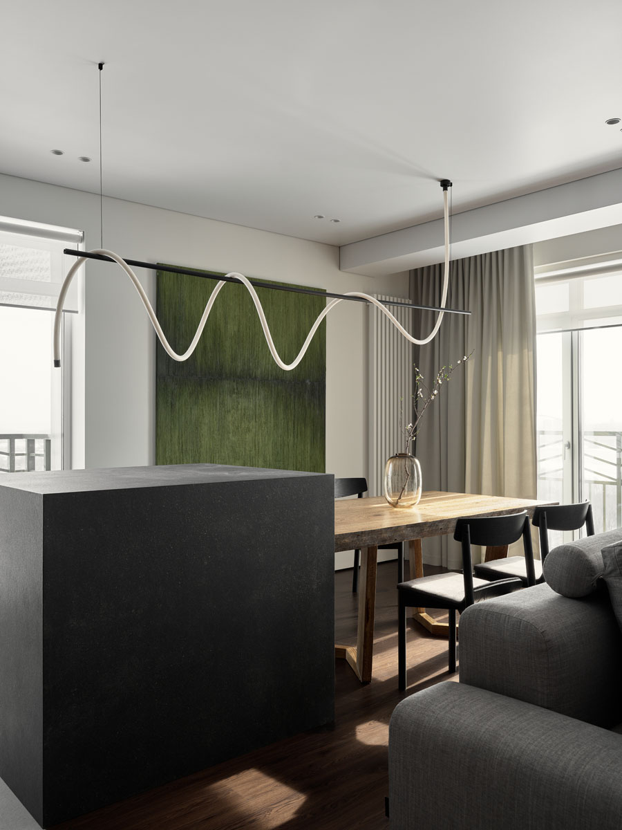 Для квартиры 97 м² с панорамным видом на Обь создали стильный и удобный интерьер по четкому запросу заказчика. В отделке объединили темное дерево, фактуру камня и природный зеленый цвет, на пол уложили практичный кварцевый ламинат Fargo.