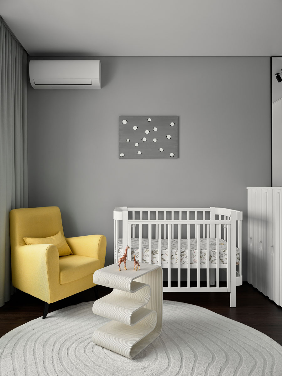 За внешним минимализмом и аккуратными стыками скрывается современная начинка: элементы умного дома, электрокарнизы, тёплый пол.